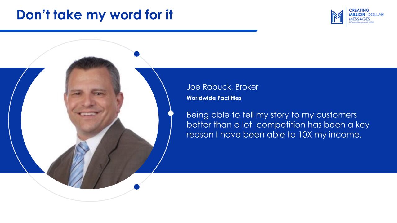 I speak from experience when I say I know the power of being able to tell your story better than the competition. If you will make the investment in yourself, I will help you build the kind of wealth, influence, and freedom that the very best enjoy!